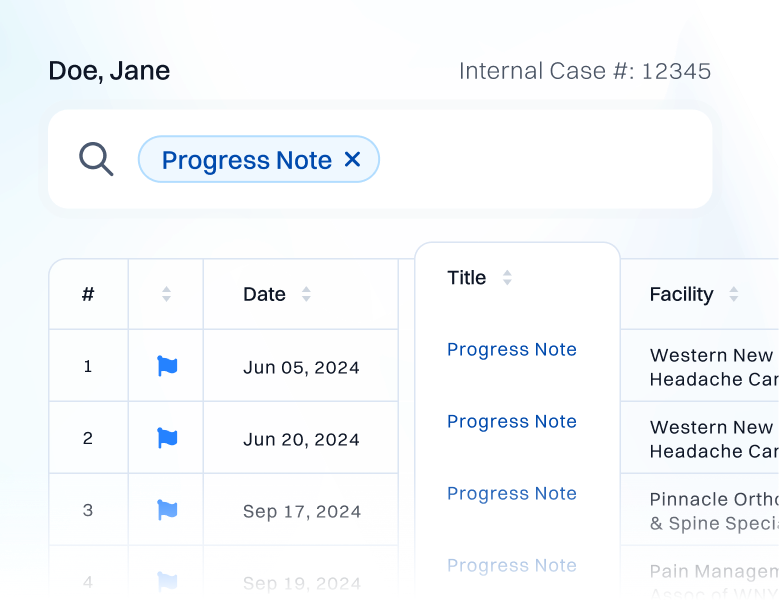 Wisedocs automatically organizes documents chronologically and by provider, making it easy to zero in on relevant notes, diagnostic reports, and timelines—no more scrolling through endless, unstructured pages.