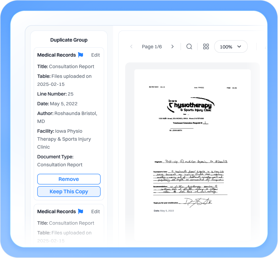 Wisedocs automatically identifies and removes duplicate medical records, eliminating redundant pages and reducing manual review time.