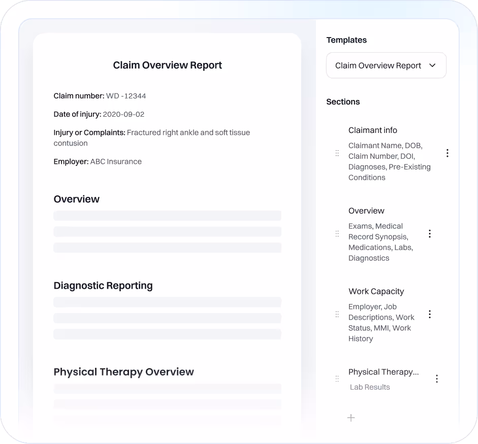 Adjusters can apply predefined templates to every claim—ensuring consistent insights across claims, no matter who’s reviewing.