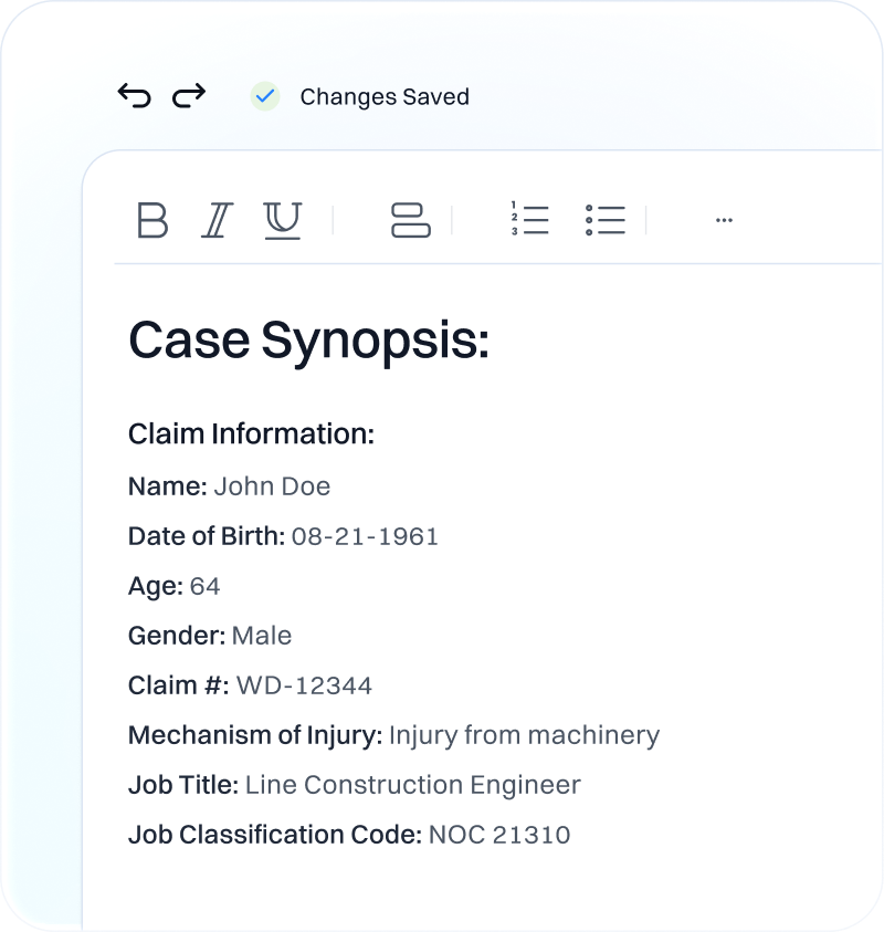 Quickly analyze first reports of injury, progress notes, and decision letters to efficiently identify pre-existing conditions and impairments — empowering workers’ comp teams to make more informed and accurate decisions for case resolution.