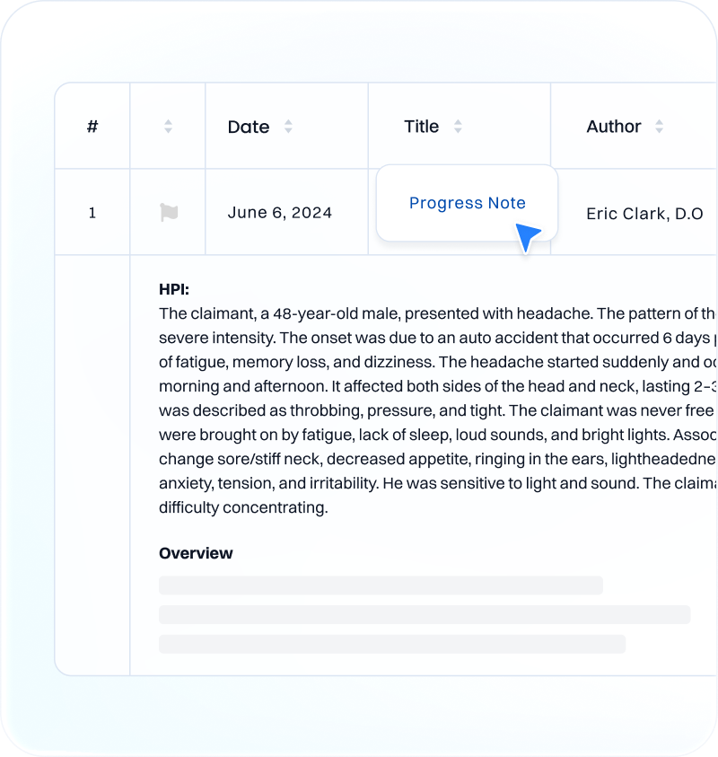 Cut through the noise and quickly assess return to work timelines with automated workflows. Auto sort medical records by progress notes, claim forms, evaluation reports and more to help workers’ comp professionals like adjusters and case managers resolve cases faster and get injured employees back to work sooner.