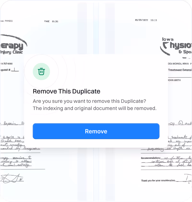 Automatically detect and remove duplicate medical records to streamline claims review. Wisedocs identifies and removes duplicate documents so adjusters, case managers, and legal teams can focus on what matters — reducing manual effort and improving clarity across workers’ compensation claims.
